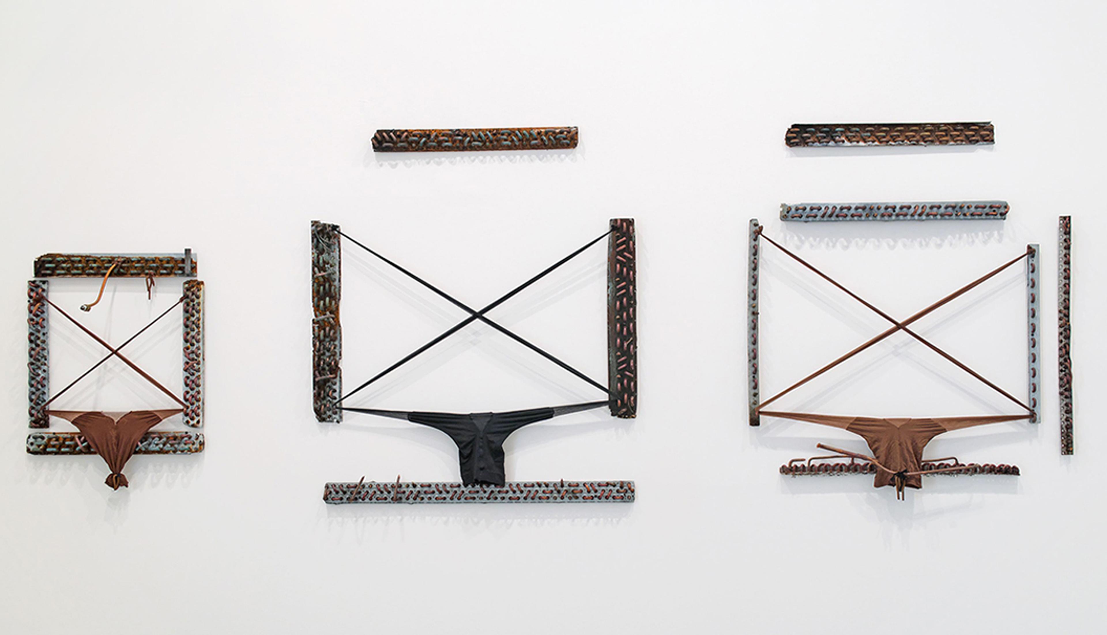 Senga Nengudi (b. 1943), "A.C.Q. - Cross Eyed, A.C.Q. - Cross Ban, A.C.Q. - Cross Waves", 2016-2017, refrigerator parts and nylon pantyhose, (left to right) 27 x 20 in, 35 x 45 in, 43 x 30 in. Art Bridges.