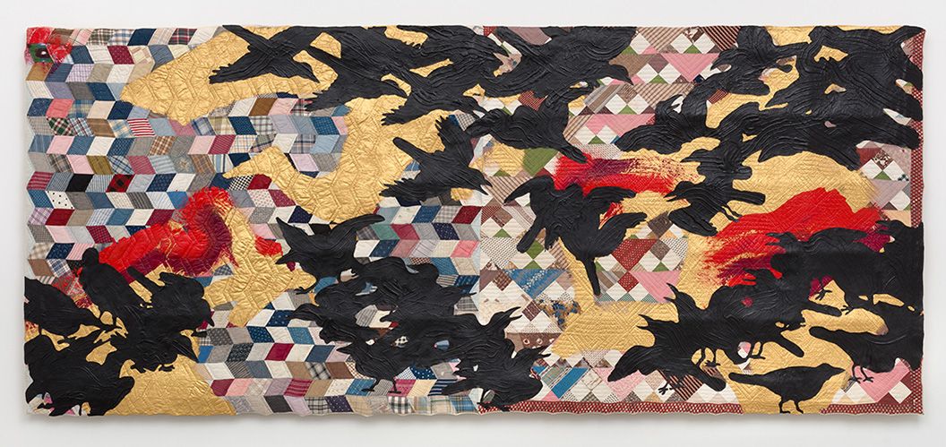 There are various ways the title of this work, Slow Murder, can be interpreted. “Murder” could reference the clustering of the crows that Biggers paints on top of this assemblage of textiles, as a group of crows is called a “murder.” Additionally, “slow murder” could speak to the crows’ participation in a type of torturous slow death, like lynching. This reading calls to mind the lyrics of Billie Holiday’s well-known protest song “Strange Fruit” (1939): “Here is a fruit for the crows to pluck.” In considering this work within the contemporary socio-political context, “slow murder” could also speak to the recent and ongoing slow, suffocating murders of Black Americans via acts of police brutality.