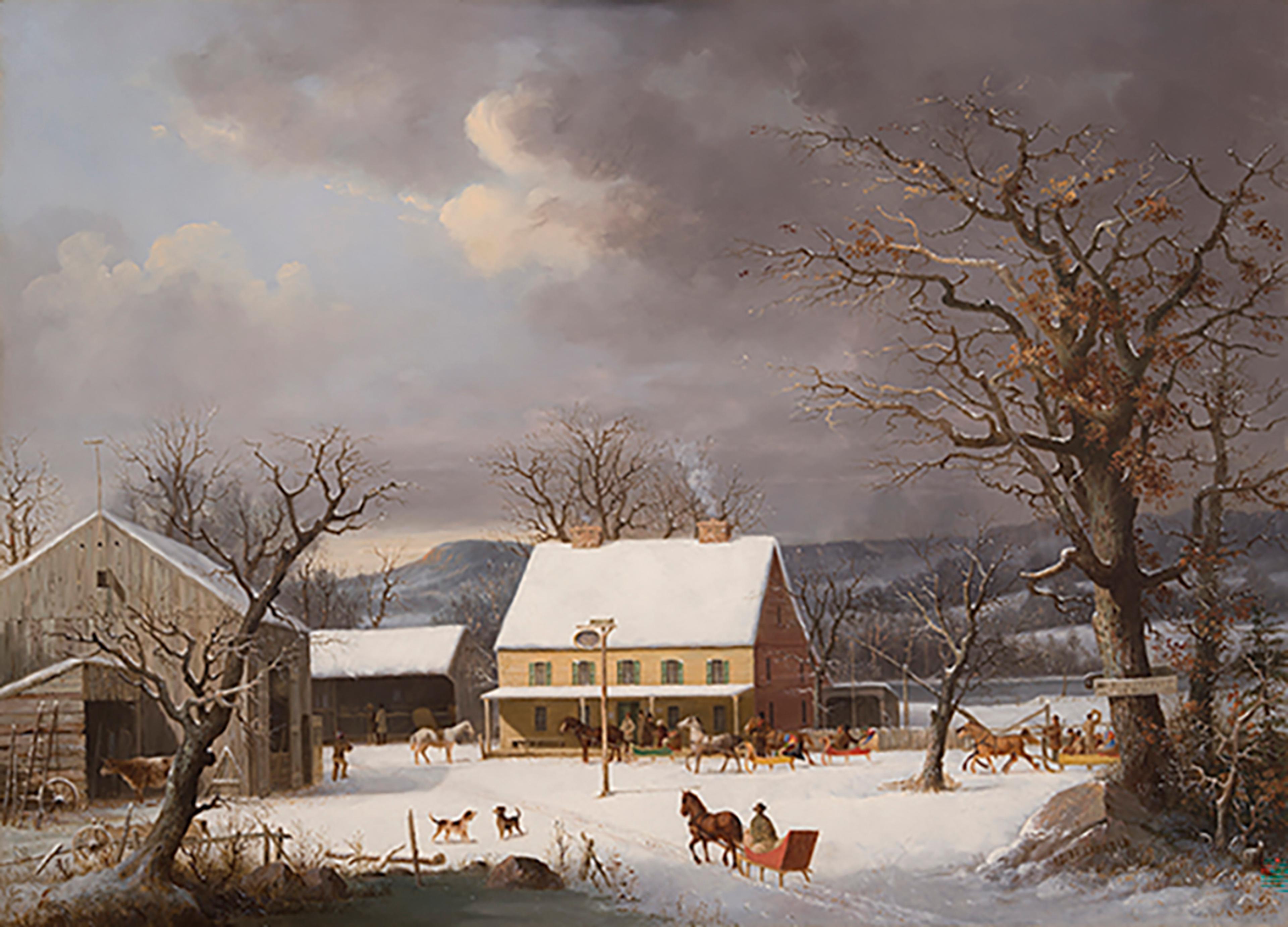To Hartford--IX Miles depicts a wintertime scene in rural Connecticut. The path in the foreground leads the viewer’s eye to a bustling inn, and the colorful sleds, prancing horses, and smoking chimney add a sense of mirthful warmth to the otherwise frigid scenery.