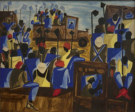 This work is part of a ten-painting series by Lawrence, created for Fortune magazine. The series documented the experience of Black southern life. While working on the paintings, Lawrence observed that "Negroes ... are working hard to obtain equality of economic, educational, and social status, which has been denied several millions of Negroes over three hundred years."