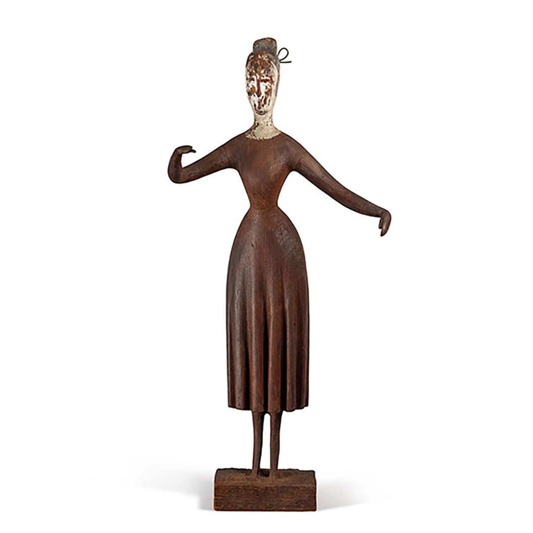 Polish-born sculptor Elie Nadelman arrived in New York City at the onset of World War I. With his reputation firmly established by his inclusion in the 1913 Armory Show, the classically-trained European artist soon turned his attention to American folk art. Chanteuse synthesizes stylistic vocabularies into a form that is modern and traditional, cosmopolitan, and homespun. Parting from the techniques and materials associated with classical sculpture, such as marble and bronze, Edelman picks up the humble carving knife and cuts the curvilinear flow of European modernism into American cherry. Although rendered in a vocabulary reminiscent of rural self-trained artists, Nadelman’s subjects were plucked from New York City’s nightlife, a bustling cityscape inhabited by colorful characters swirling about concert halls and theaters. In Chanteuse, a singing woman raises her arms as if to signify the power of her voice during a performance. The work foregrounds Nadelman’s emphasis on abstracted but delicate curvilinear forms that add up to anonymous and idealized figures.