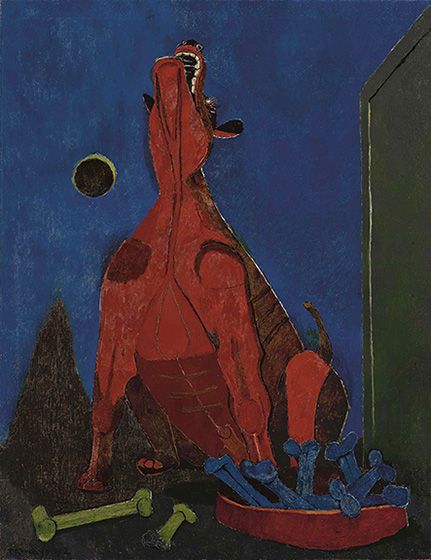 Created in 1942, Perro aullando a la luna typifies a stage in Tamayo’s production related to the strife of World War II. During this time, the serenity of the artist’s previous paintings was supplanted by a chromatic intensity and formal tension.