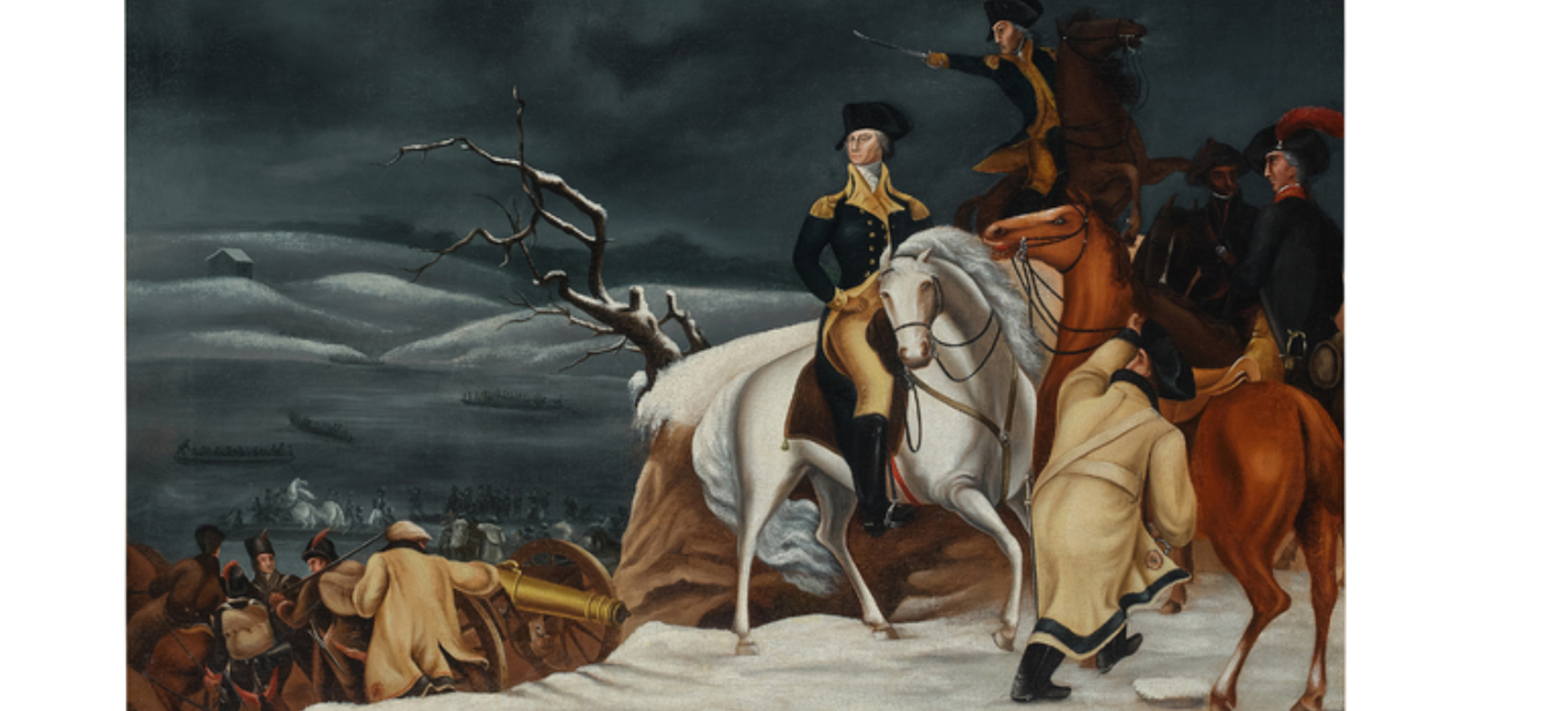 This work by Edward Hicks memorializes and celebrates a turning point in the Revolutionary War. In the winter of 1776, the Continental Army, under the leadership of General George Washington, outmaneuvered the British troops and Hessian mercenaries stationed in Trenton, New Jersey by crossing the Delaware River and launching a surprise attack. This daring plan was commemorated in many paintings in the aftermath of the American Revolution. Edward Hicks, who was best known for his Peaceable Kingdom pictures, was a resident and preacher in the area of Pennsylvania where the crossing took place, and he painted several versions of this canvas, modeling them after Thomas Sully’s The Passage of the Delaware (1819).