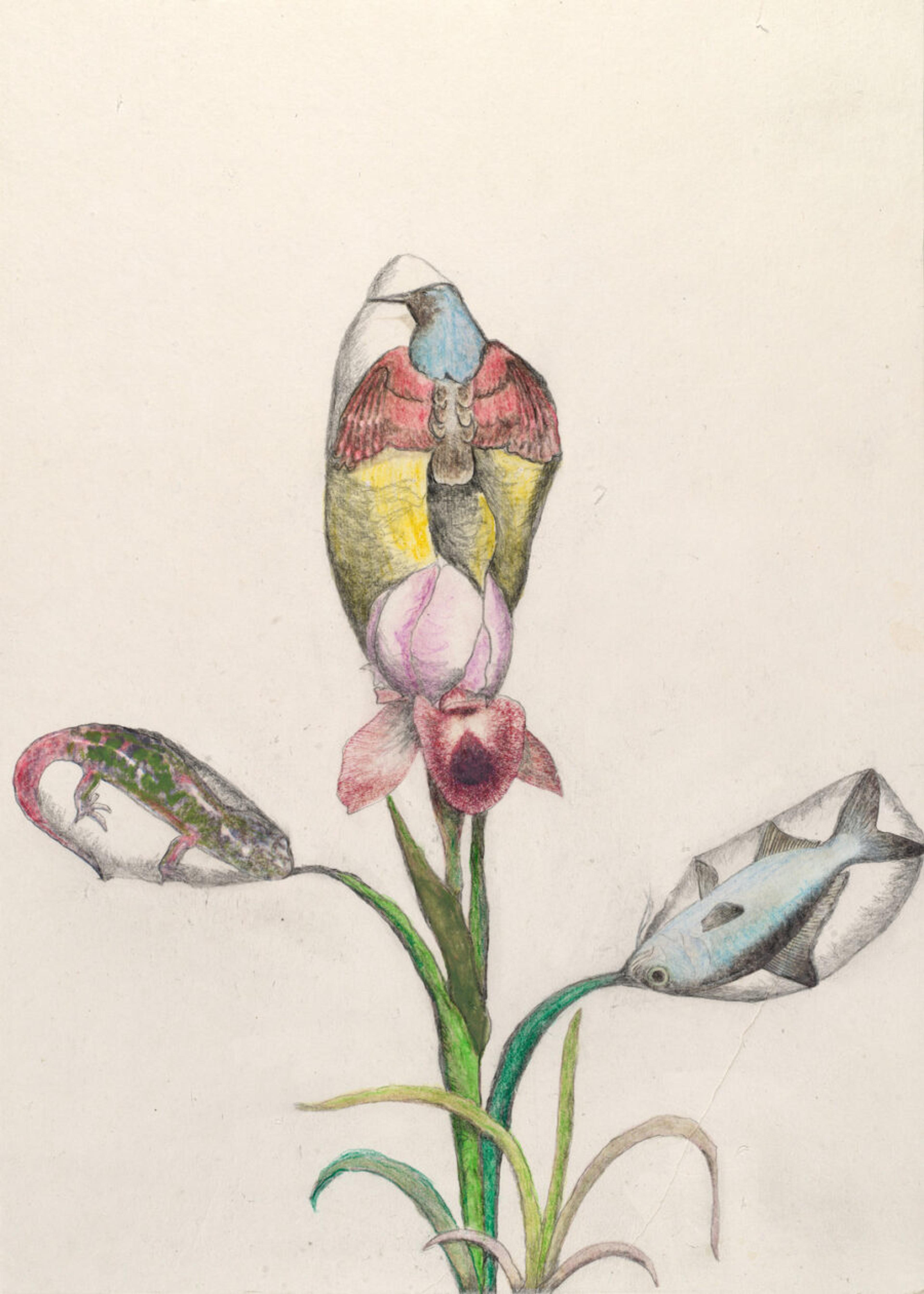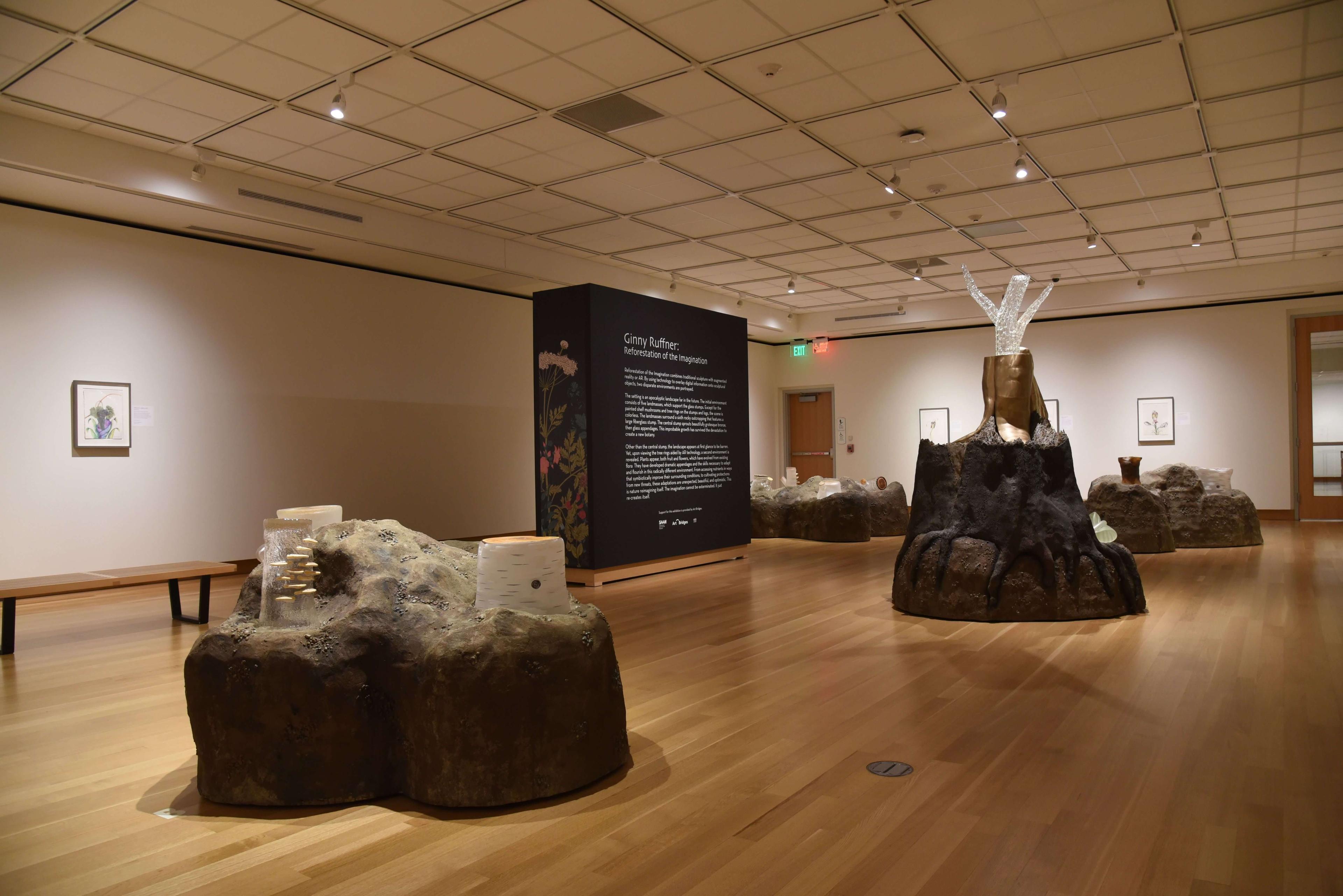 The installation consists of six islands, each featuring colorless glass sculptures of tree stumps. The landscape appears barren and bleak. Ruffner has imagined a gloriously complex and colorful alternative environment that viewers can access using AR’s technological lens. In this second reality, the stumps grow unique appendages of mythical flora. Ruffner designs these fictional species to adapt to their surrounding conditions in a means unexpected, beautiful, and optimistic. These plants have evolved from existing fruits and flowers, developing dramatic appendages and skills necessary to flourish in this radically different environment. Reforestation of the Imagination calls into question our very notions of reality and fantasy, of concrete and abstract, and of desolation and hope, all while drawing attention to contemporary ecological issues. The installation also includes nineteen drawings that were the inspiration for the AR images.