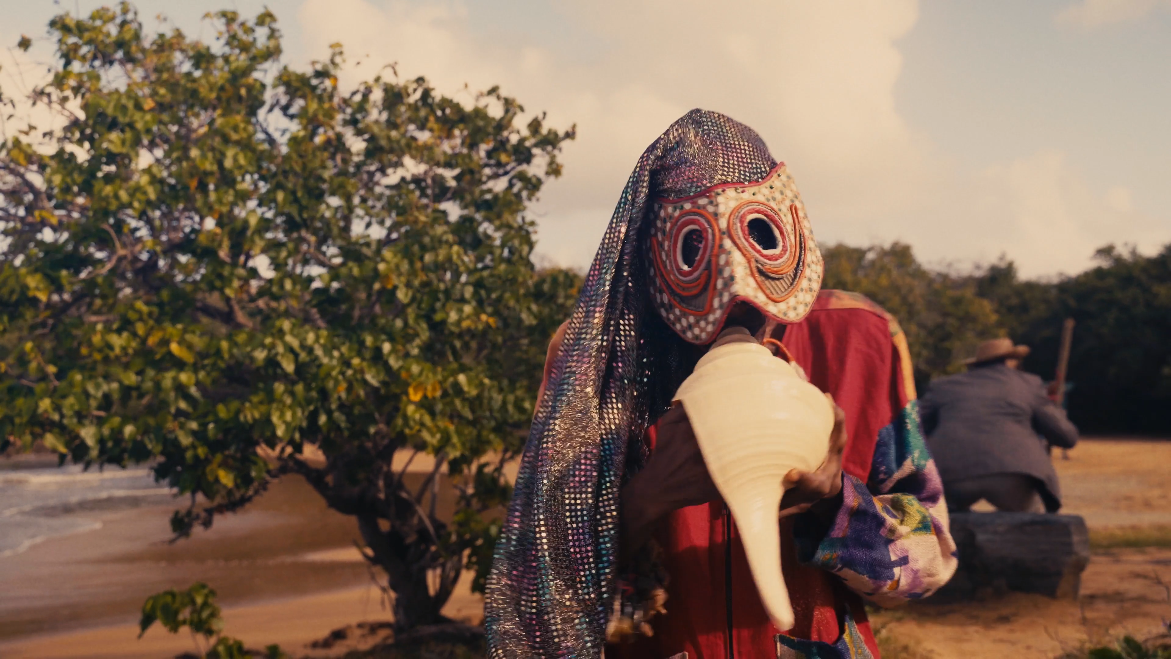In Talegas de la memoria, Lind Ramos presents an allegory of the history and colonization of Puerto Rico starring the cultural expressions of Loíza. Filmed on a beach in Loíza, the video musically dramatizes the historical transformations that have taken place in Puerto Rico. Performed by characters linked to the popular performers of the Santiago Apóstol Festival, the festivities serve as a prism to interpret the world. Two accompanying sculptures are beacons that honor the keepers of culinary knowledge in Loíza. Becoming Wind and Current investigates the history of marronage of enslaved people who fled from the island of Saint Croix to Loíza, Puerto Rico in search of their freedom. Belle created the floating coconut installation seen in the video, which is inspired by the descriptions of the tribal marks borne by the enslaved included in advertisements seeking their return as property. The work is a poetic essay on the history of marronage and its implications today.
