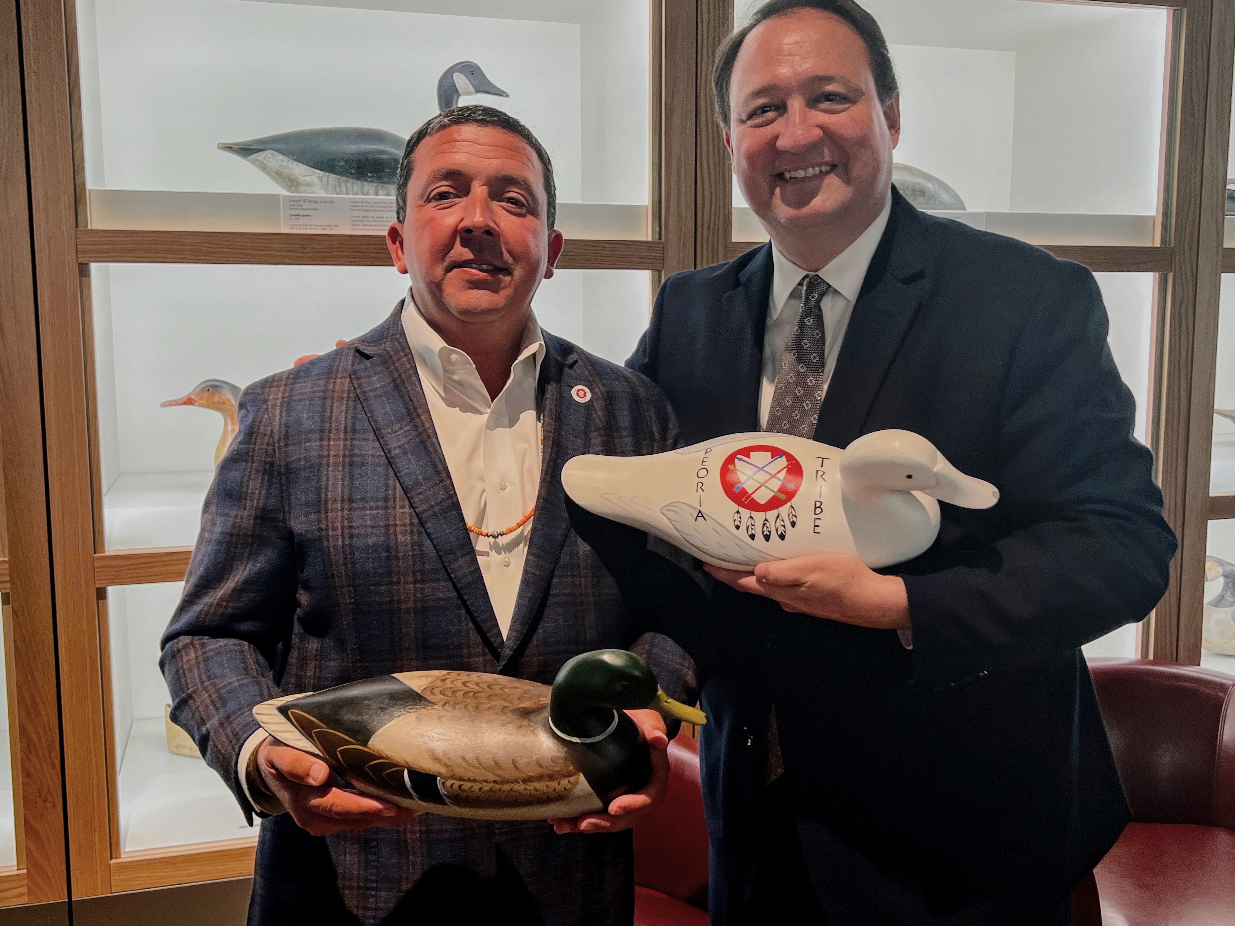 Chief Craig Harper of the Peoria Nation and Peoria Riverfront Museum CEO John Morris exchange decoys as a sign of true partnership. Photo courtesy of Peoria Riverfront Museum.